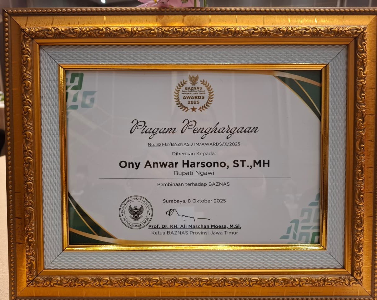 Baznas Ngawi: Bupati Ngawi, Ony Anwar, menerima penghargaan kategori Pembinaan terhadap BAZNAS (Badan Amil Zakat Nasional) dari BAZNAS Provinsi Jawa Timur. Penghargaan ini diserahkan dalam acara Rakornas (Rapat Koordinasi Nasional) BAZNAS Jawa Timur yang bergengsi, bertema “Menguatkan BAZNAS dalam Mendukung Asta Cita”, di Mercure Hotel Surabaya, pada Selasa (8/10).