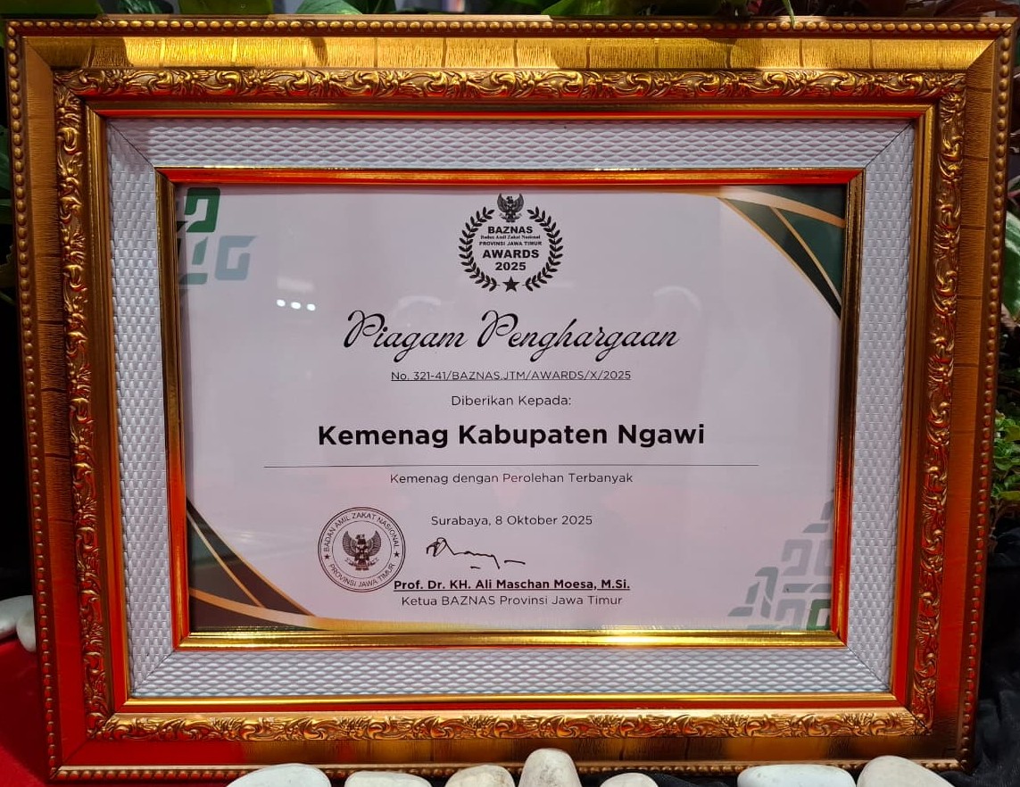 Baznas Ngawi: Kantor Kementerian Agama (Kemenag) Kabupaten Ngawi meraih penghargaan kategori Pengumpulan Terbanyak dari Badan Amil Zakat Nasional (BAZNAS) Provinsi Jawa Timur. Prestasi ini diraih dalam acara Rapat Koordinasi Daerah (Rakorda) BAZNAS Jawa Timur yang bergengsi, bertema “Menguatkan BAZNAS dalam Mendukung Asta Cita”, yang digelar di Ballroom Hotel Mercure Surabaya pada Rabu (8/10).